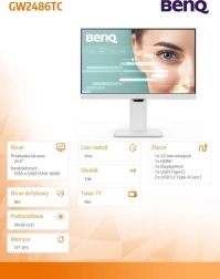 Le moniteur élégant 23,8" BENQ GW2486TC offre une image nette avec la technologie IPS, un affichage fluide grâce à 100 Hz et un confort visuel avec Low Blue Light et Flicker-Free. Un temps de réponse rapide de 4 ms et un contraste de 1300:1 assurent une excellente expérience au travail comme pour le divertissement.