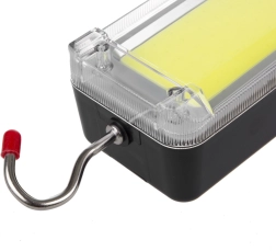 Pour une flexibilité maximale, la lampe est équipée d’un crochet pivotant pour la suspension, d’aimants pour la fixation sur les surfaces métalliques et d’un clip dans la poignée pivotante pour un serrage ferme sur une table ou une étagère. L’alimentation par deux batteries rechargeables de 1200 mAh offre jusqu’à 4–6 heures d’autonomie et la recharge se fait facilement via câble USB.