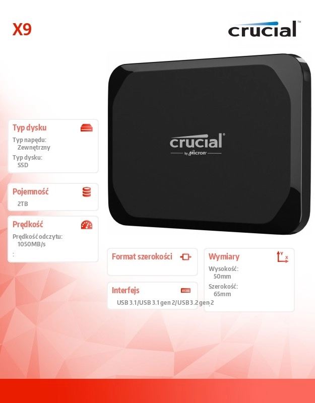 Le SSD externe compact Crucial X9 offre une vitesse jusqu’à 1050 Mo/s, une capacité de 2 To et une connectique universelle USB‑C 3.2 Gen 2. Il est jusqu’à 7,5× plus rapide que les HDD classiques, résiste aux chutes jusqu’à 2 m et fonctionne en plug-and-play avec PC, Mac, tablettes, consoles de jeu et téléphones Android.