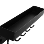 Ce range-mur polyvalent allie fonctionnalité et design minimaliste. Sa structure métallique thermolaquée garantit une longue durée de vie, tandis que l’étagère supérieure à rebord surélevé (env. 2,3 cm) maintient en sécurité téléphone, portefeuille, courrier et petits objets. Les six crochets robustes sont parfaits pour les clés, écharpes, sacs ou ustensiles de cuisine.