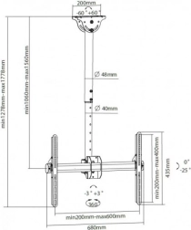 Support plafond universel pour téléviseurs LCD/LED 37–70" avec une capacité de 50 kg. Sa structure en acier robuste garantit une fixation sûre, compatibilité VESA, passage de câbles intégré, longueur réglable, inclinaison et rotation, et possibilité de montage même sur des plafonds inclinés.