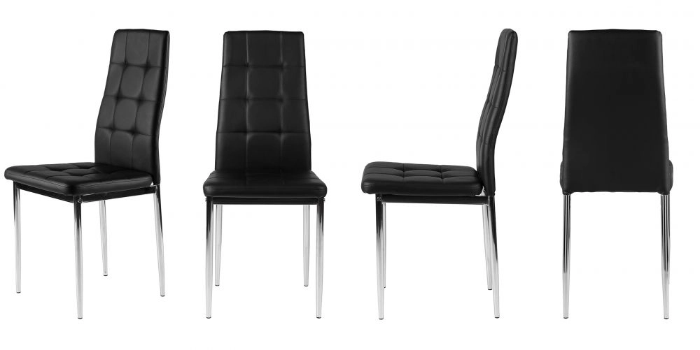 Cet ensemble de quatre chaises est un choix idéal pour les salles à manger et salons modernes. Les chaises noires avec matelassage élégant apportent une apparence sophistiquée à l'intérieur. Elles disposent d'un dossier profilé élevé et d'un siège en mousse PU souple, ce qui assure un confort exceptionnel.