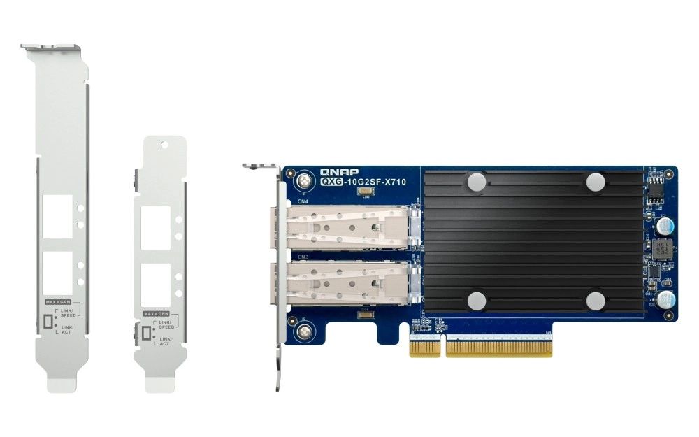 La QNAP QXG-10G2SF-X710 est une carte réseau professionnelle avec deux ports SFP+ (10G/1G) qui apporte une connectivité 10GbE haut débit aux stations de travail et aux serveurs NAS. Grâce à son grand dissipateur passif, elle fonctionne totalement sans ventilateur et convient ainsi aux environnements sensibles au bruit.