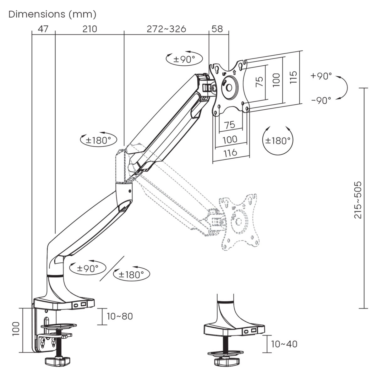 - Compatible avec la norme VESA : 75x75, 100x100 mm.