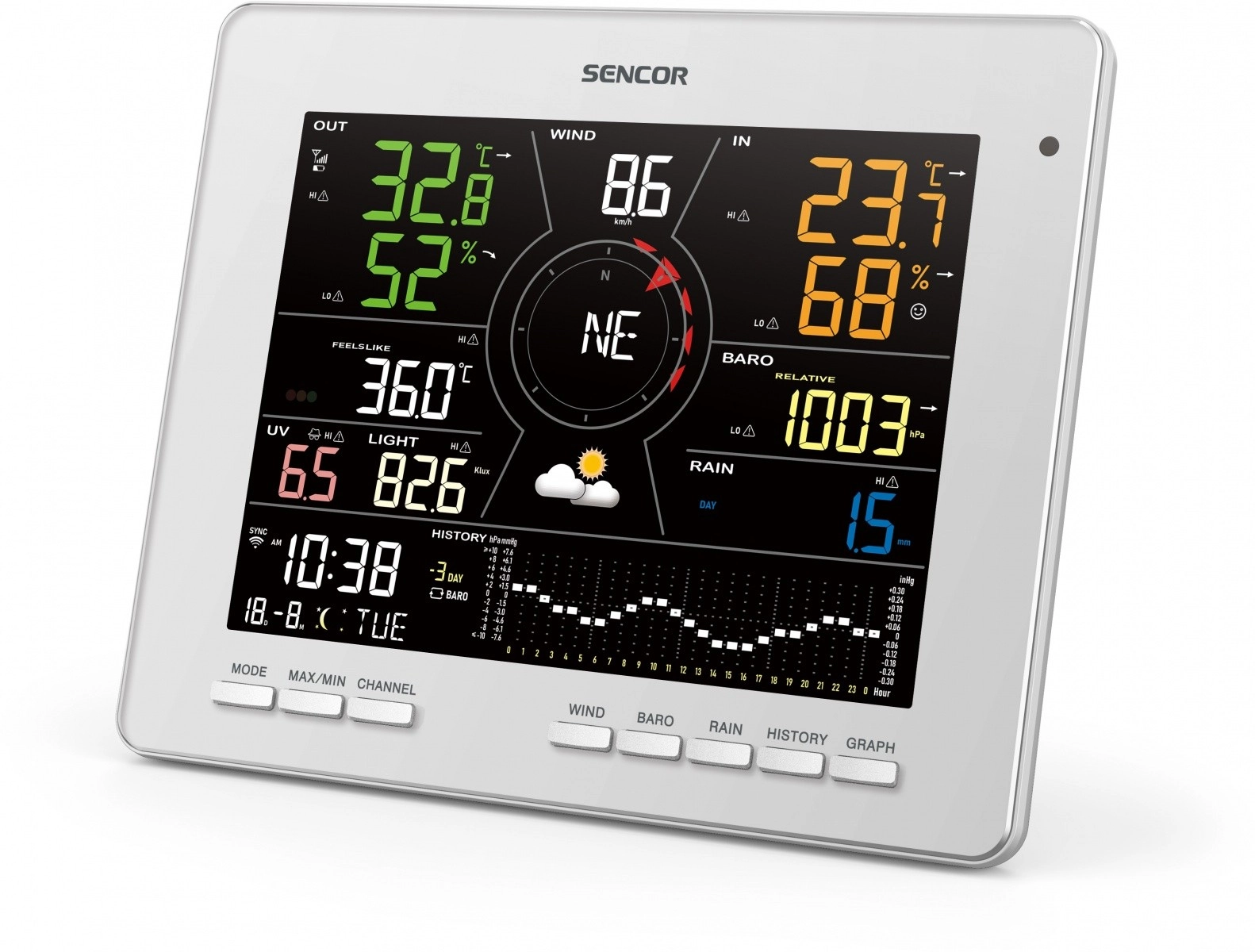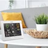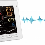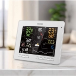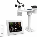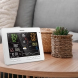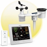 Le grand écran LCD TRUE BLACK 7,8" avec affichage couleur montre non seulement la température et l’humidité intérieures et extérieures avec indicateur de confort, mais aussi la pression, le vent, les précipitations, l’indice UV, l’intensité lumineuse et des graphiques de tendances clairs. On retrouve une prévision 12–24 h basée sur la tendance barométrique, l’heure, le calendrier, les phases de la Lune et les heures de lever/coucher du Soleil, ainsi que des alarmes pratiques pour les extrêmes météo.