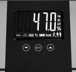 L’utilisation est extrêmement simple: bouton SET et flèches pour saisir l’âge (18–80 ans), la taille (100–220 cm) et le niveau d’activité 1–5, choix du profil femme/homme/sportif et commutation pratique des unités kg/lb/st via le bouton UNIT sur la face inférieure. Après la mesure, la balance s’éteint automatiquement au bout de 60 s, économise la batterie et reste prête pour la prochaine utilisation.