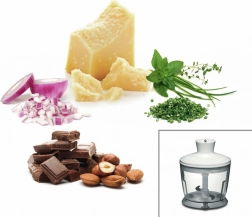 Le hachoir universel hache herbes, noix ou parmesan en un rien de temps. Certains accessoires sont lavables au lave-vaisselle pour un entretien facile.