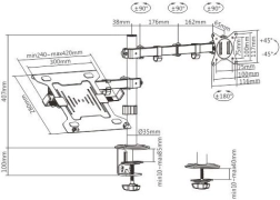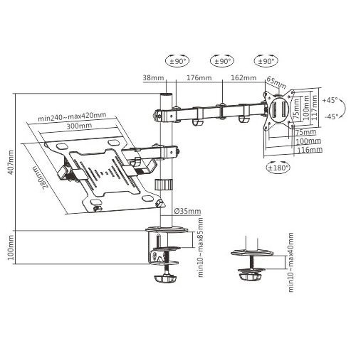 La pince de fixation solide s’ancre fermement au plateau du bureau et des clips pratiques aident à organiser les câbles. La compatibilité VESA 75×75 et 100×100 mm assure une installation simple pour presque tout moniteur LCD jusqu’à 32″, tandis que le plateau supporte en toute sécurité un ordinateur portable jusqu’à 15,6″.