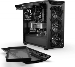 Les trois ventilateurs Pure Wings 3 140 mm PWM préinstallés fournissent un flux d’air élevé avec un faible bruit — même à des vitesses plus élevées, le fonctionnement reste maîtrisé. On retrouve également une installation sans outils pour les disques, une gestion des câbles soignée et un filtre à poussière amovible pour un entretien simplifié.