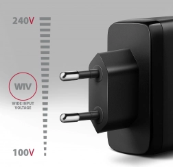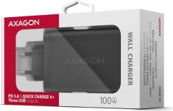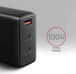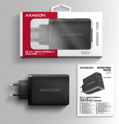 Puissant chargeur secteur de voyage AXAGON GaN 100 W capable de recharger simultanément jusqu’à trois appareils. Il offre 2× USB‑C et 1× USB‑A, la prise en charge de PD 3.0, QC 4+, PPS, Samsung SFC 2.0 45 W et Apple PD 20/27 W. Grâce à la technologie GaN, il est compact, efficace et sûr pour les ordinateurs portables, téléphones et tablettes.