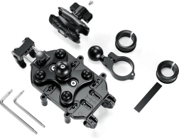 - corps principal du support, bras à double articulation, vis antivol, base pour guidon, pochette antidérapante, anneaux en caoutchouc, clé spéciale, tournevis