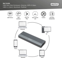 Boîtier externe compact en aluminium pour SSD M.2 SATA avec interface USB‑C 3.1 Gen 2 offrant un transfert rapide jusqu’à 6 Gbit/s, une installation sans outil et une large compatibilité avec les formats 2230/2242/2260/2280. Conception robuste avec refroidissement passif, capacité jusqu’à 8 To et compatibilité Windows, macOS, Linux, Chrome OS, Android et iOS – un choix idéal pour le stockage mobile des données.