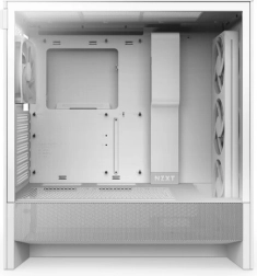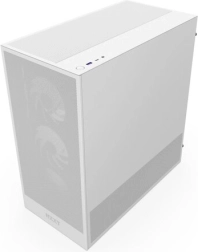 NZXT H5 Flow RGB est un boîtier d'ordinateur mid-tower élégant et blanc, conçu pour améliorer la circulation de l'air et le refroidissement. Idéal pour un refroidissement efficace grâce à des panneaux perforés et une prise en charge des grands refroidisseurs.