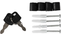 L'emballage comprend un kit de montage avec quatre chevilles et entretoises, permettant une installation immédiate après déballage. La boîte contient deux clés pour une sécurité accrue.