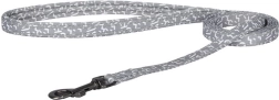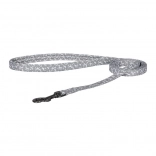 Laisse en nylon durable avec motif réfléchissant pour plus de sécurité lors des promenades du soir. Mousqueton métallique pour une fixation rapide et sûre au harnais.