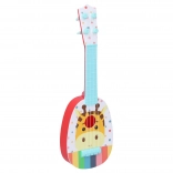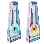 Cette guitare d'enfant avec un motif d'animaux africains est idéale pour les petits débutants. Elle possède quatre cordes en plastique et une longueur de 37 cm, ce qui la rend parfaite pour une prise facile et un jeu agréable.
