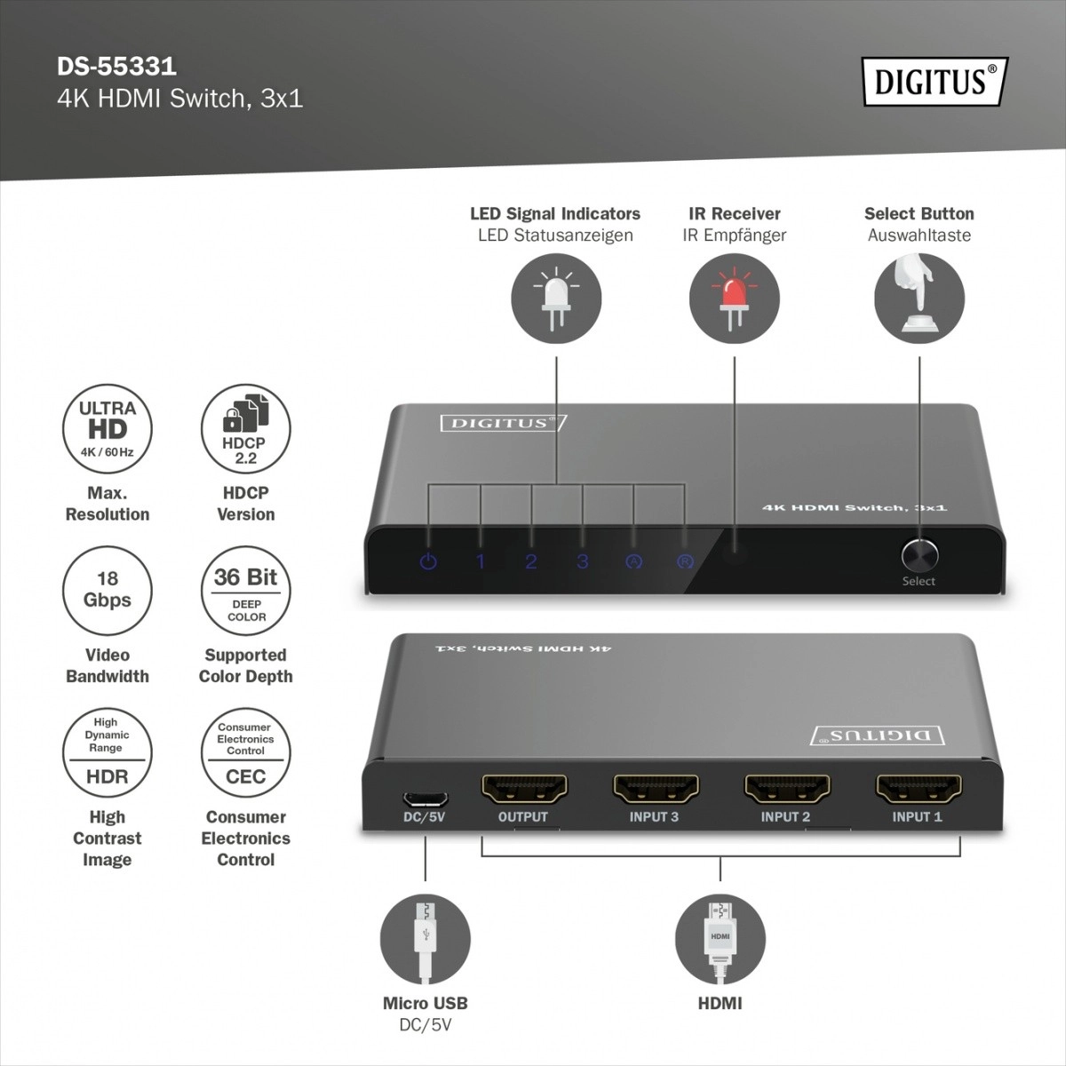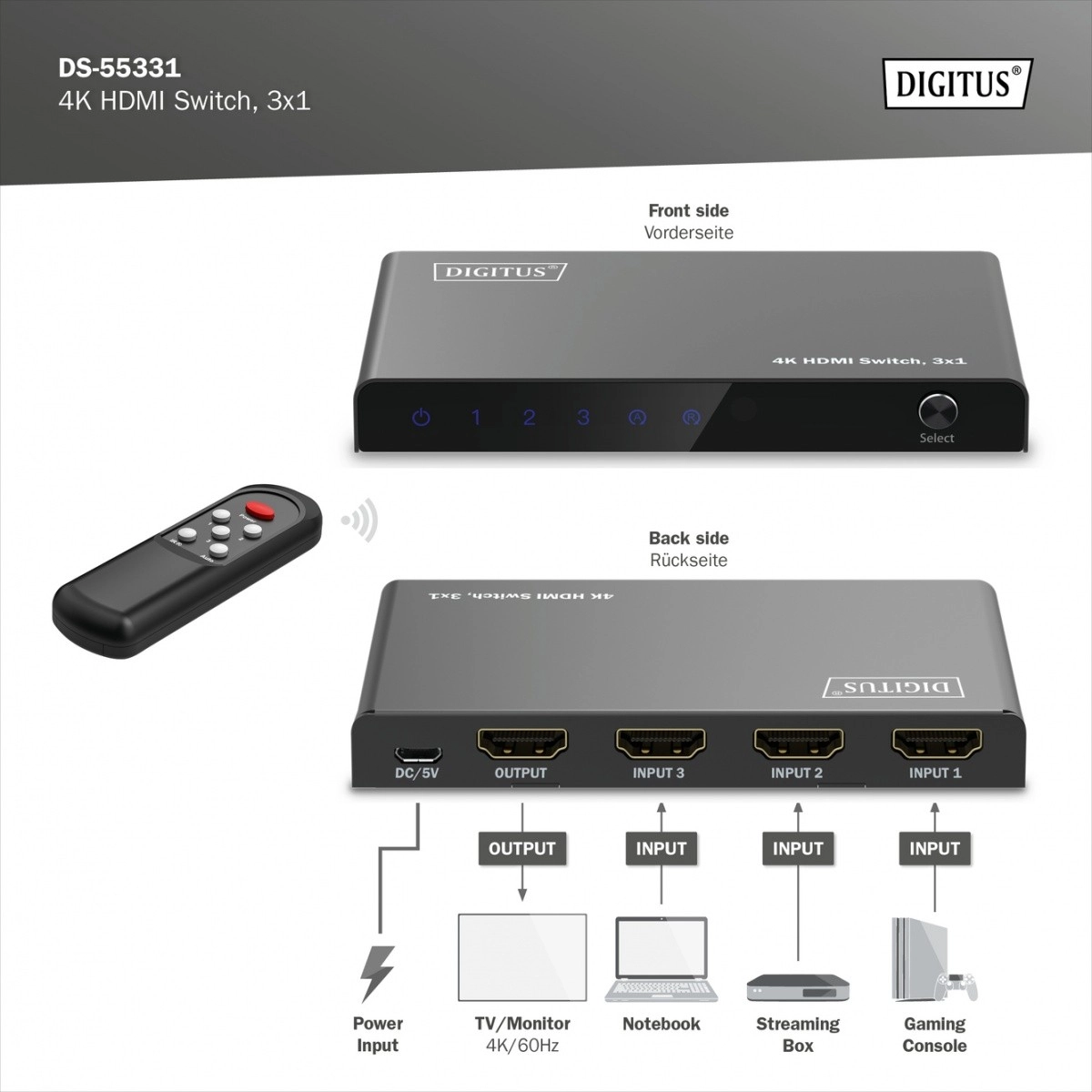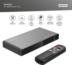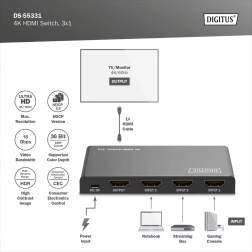 Fini les changements de câbles incessants. Le commutateur compact DIGITUS 4K HDMI 3×1 ajoute élégamment trois entrées HDMI complètes à votre installation. Grâce à la prise en charge de l’Ultra HD 4K à 60 Hz et du HDCP 2.3, profitez d’une image nette et d’une lecture fluide depuis des consoles de jeu, décodeurs, ordinateurs portables ou lecteurs multimédias.