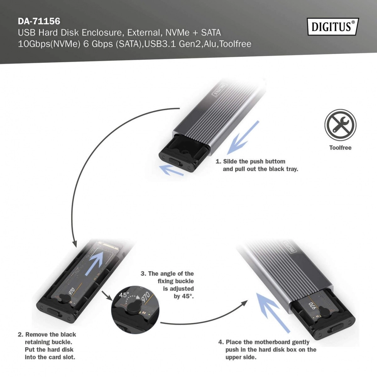 Étendez votre stockage en un instant avec un boîtier compact et robuste en aluminium (Pantone 430C). Il offre des transferts haut débit jusqu’à 10 Gb/s (NVMe) et 6 Gb/s (SATA), est entièrement plug and play et s’alimente directement via USB. La conception sans outil permet un remplacement rapide des disques.