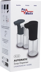Le distributeur de savon sans contact PROMEDIX de 300 ml offre un dosage hygiénique sans contact, un capteur infrarouge et une régulation du volume en trois niveaux. Alimenté par 4× piles AA, il se place n'importe où dans la salle de bain, la cuisine ou le bureau. Il inclut une buse interchangeable pour pulvérisation pour une utilisation universelle avec savon, désinfectant ou shampooing.