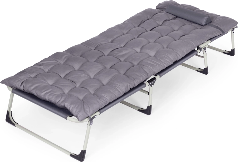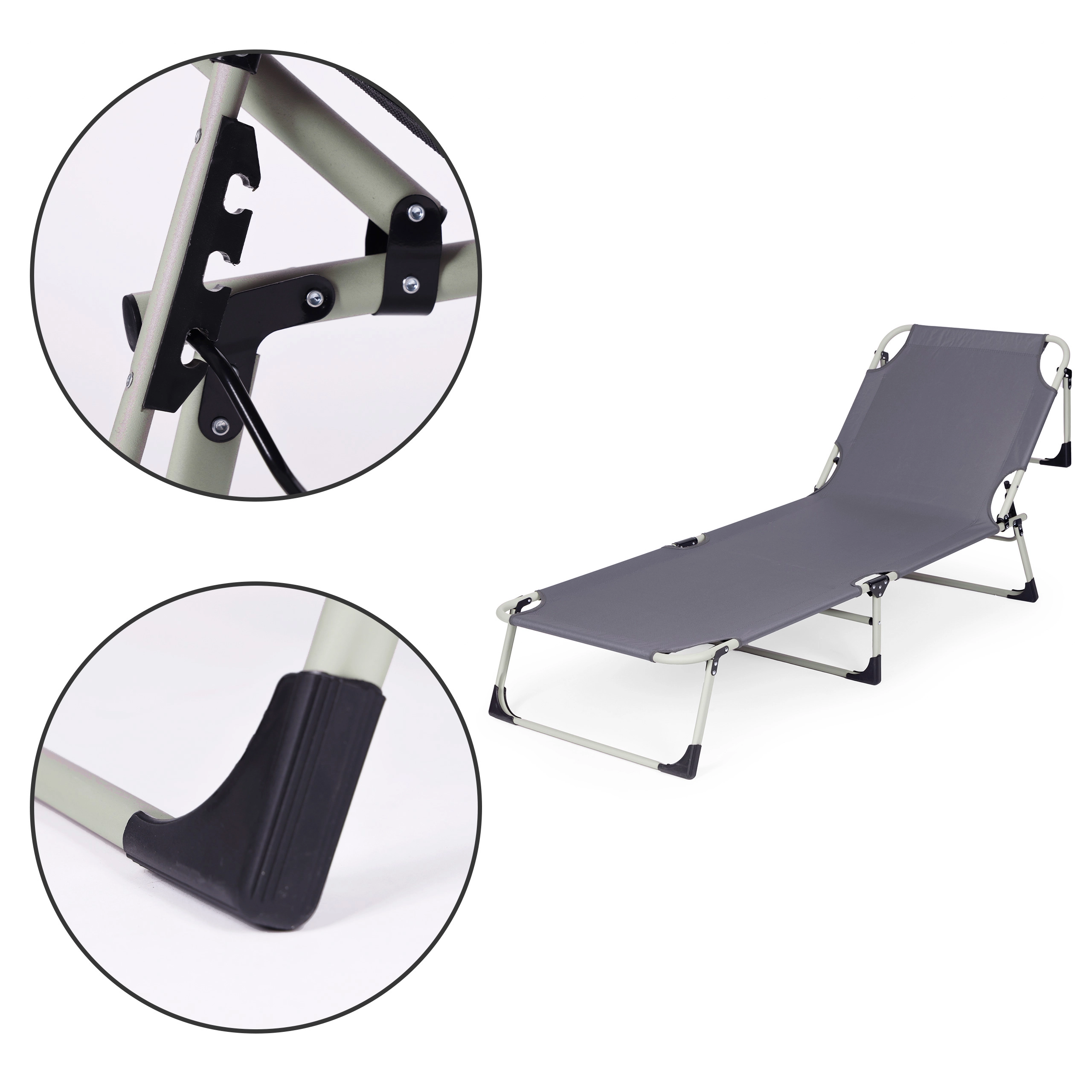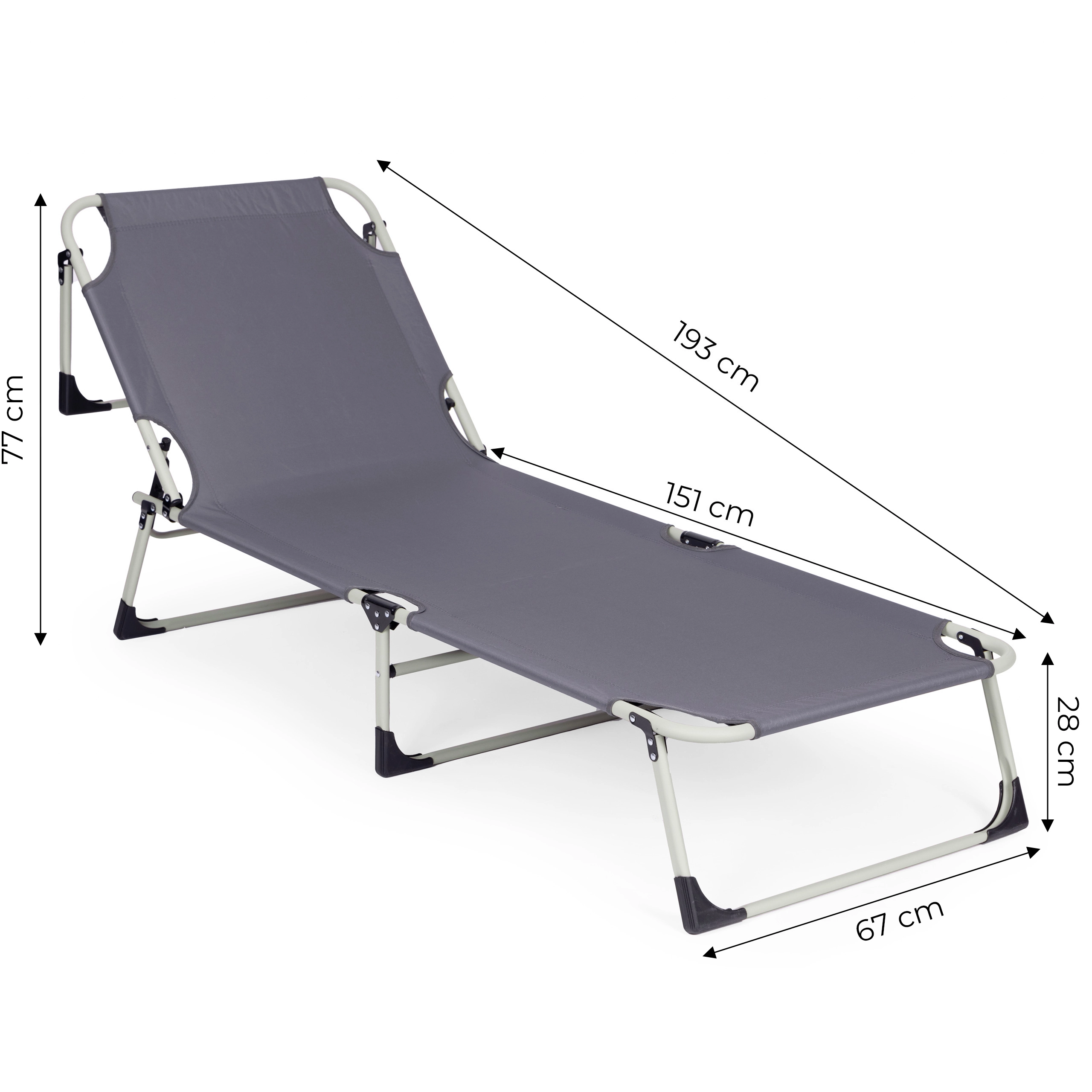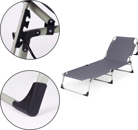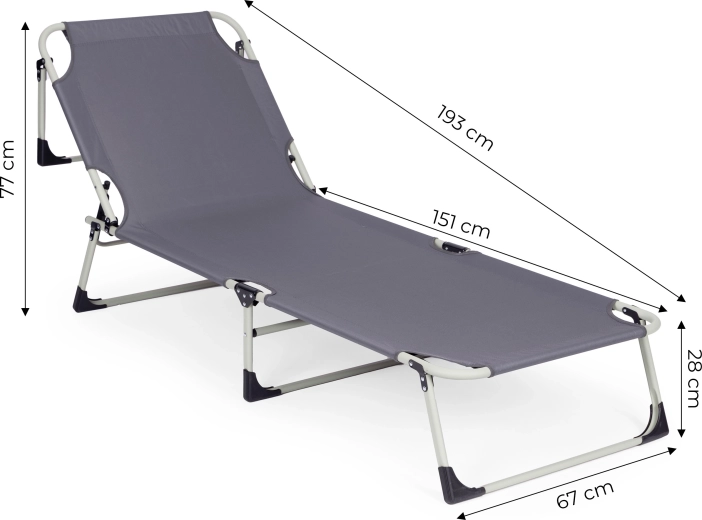 Le cadre robuste en métal revêtu par poudre et les patins antidérapants assurent la stabilité sur différentes surfaces. La housse en Oxford 600D est facile à entretenir et prête pour un usage extérieur. Grâce à sa structure pliante, la chaise longue se plie et se range ou se transporte facilement.