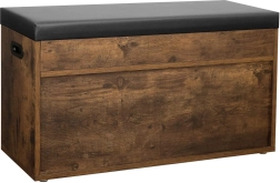 \nBanc à chaussures en bois de style loft offre une apparence moderne et une praticité en un. Fabriqué en panneau de particules, il dispose d'un siège noir doux sur le dessus, facilement amovible grâce au velcro. En dessous, vous trouverez suffisamment d'espace de rangement pour les chaussons ou de petits vêtements comme des bonnets, des écharpes ou des gants.