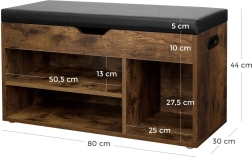 \nLe banc est équipé de trois étagères - deux larges (50,5x13 cm), une plus étroite (25x27,5 cm) et un espace supplémentaire sous le siège (80x30 cm). Le style loft moderne ajoute du chic à l'intérieur.