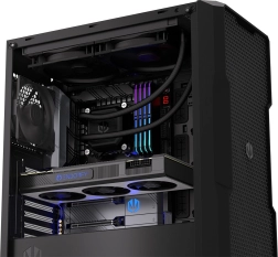 La paire de ventilateurs 140 mm avec pales profilées et bord ondulé assure un flux d’air optimal à travers le radiateur à forte densité d’ailettes tout en maintenant un faible niveau sonore.