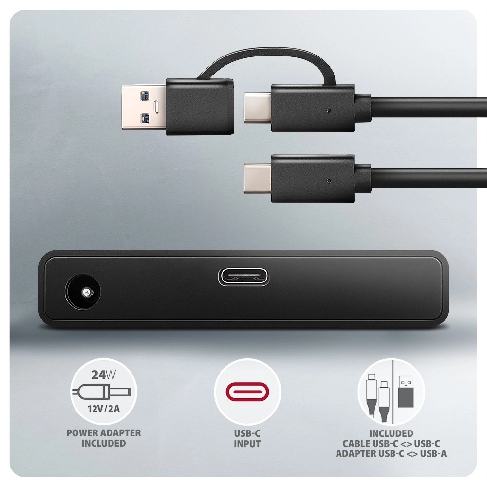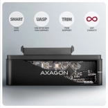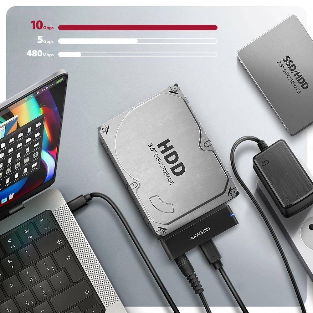 Pour les disques 3,5", le coffret comprend un adaptateur secteur AC/DC 12V/2A (24 W), tandis que les SSD/HDD 2,5" fonctionnent aisément via l’alimentation par USB. L’adaptateur prend en charge des technologies modernes pour une longue durée de vie et une fiabilité élevée : UASP pour des transferts plus rapides, TRIM pour maintenir les performances des SSD, surveillance S.M.A.R.T., possibilité de démarrer depuis le disque connecté, Auto Spindown et Turn Off. Sa surface mate résiste aux empreintes et ses dimensions réduites garantissent que vous aurez toujours l’adaptateur à portée de main.