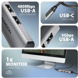 Le hub USB-C multiports AXAGON étend votre ordinateur portable, PC ou téléphone avec quatre ports. La connexion à l’appareil s’effectue via un câble USB‑C de 15 cm. Le hub permet de brancher simultanément un moniteur et trois périphériques USB.