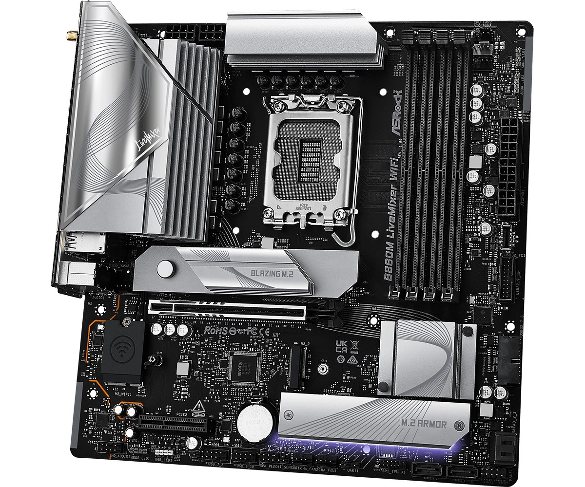 Le modèle B860M LiveMixer WiFi est conçu pour la nouvelle génération de créateurs de contenu. Il offre des performances fiables, une connectique riche et une connexion sans fil Wi‑Fi 6E (802.11axE) sur la bande 6 GHz pour une meilleure bande passante et une latence réduite. Grâce au Thunderbolt 4, vous bénéficiez d’un connecteur USB‑C universel avec des transferts jusqu’à 40 Gb/s et la prise en charge d’écrans externes comme de solutions de stockage rapides.