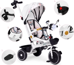 Les parents apprécieront le contrôle total de la direction grâce à la connexion de la barre de guidage au guidon du tricycle. La structure est conçue pour une stabilité optimale (large essieu arrière), un entretien facile et une longue durée de vie. La charge maximale est de 25 kg, pour un poids du tricycle de seulement 7,8 kg – le compagnon idéal pour les promenades quotidiennes.
