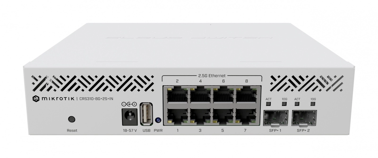 Le switch haut de gamme MIKROTIK CRS310-8G-2S+IN apporte une connectivité haut débit dans un format compact : 8× 2,5G Ethernet et 2× 10G SFP+ avec prise en charge multi‑débits (1G/2,5G/10G). Vous pouvez ainsi combiner les liens avec flexibilité ou l’utiliser comme solution jusqu’à 10× 2,5G. Un choix idéal pour faire évoluer une infrastructure gigabit existante vers des vitesses supérieures.