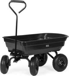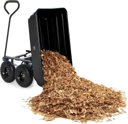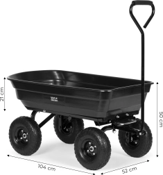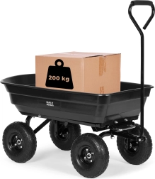 De plus, le chariot est muni d'une fonction basculante, qui facilite le déchargement, et de grandes roues de 25 cm, qui assurent un mouvement fluide et une stabilité même sur des surfaces molles.
