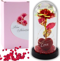 Rose éternelle de couleur rouge avec cœur et inscription "LOVE", placée dans une cloche élégante avec un doux éclairage LED, offre un cadeau unique et symbolique. Grâce aux perles rouges décoratives, elle crée un effet visuel incroyable, idéal pour les occasions romantiques.