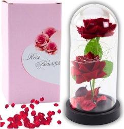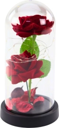 Ces élégantes roses décoratives sous une cloche transparente avec un éclairage LED doux sont le cadeau parfait pour les occasions romantiques. Deux roses artificielles accompagnées de pétales de rose créent une atmosphère incomparable.