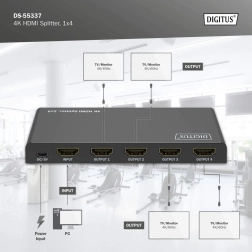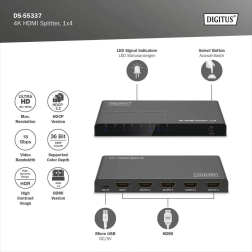 Le répartiteur HDMI DIGITUS duplique le signal audio‑vidéo d’une source vers quatre sorties avec une qualité maximale 4K à 60 Hz (4:4:4). Grâce à la gestion EDID (Auto / Copy / Downscaler), il reconnaît automatiquement les écrans connectés ou adapte les paramètres pour un affichage sans problème sur différents moniteurs en simultané.