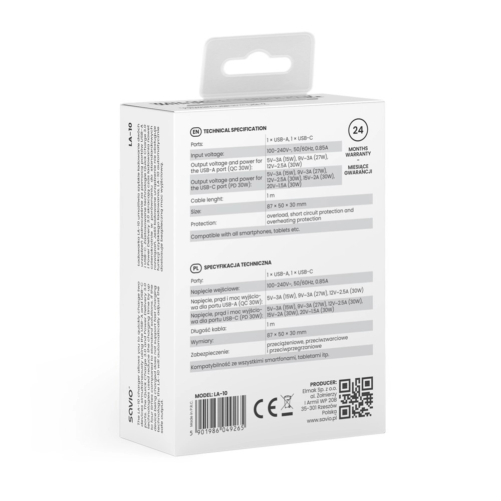 Profitez d’une charge rapide et sûre sans compromis. Le chargeur Savio 30 W combine USB‑C PD pour les appareils modernes et USB‑A QC 3.0 pour une large compatibilité avec les câbles plus anciens. Son boîtier compact avec prise EU se glisse facilement dans une poche ou un sac de voyage.