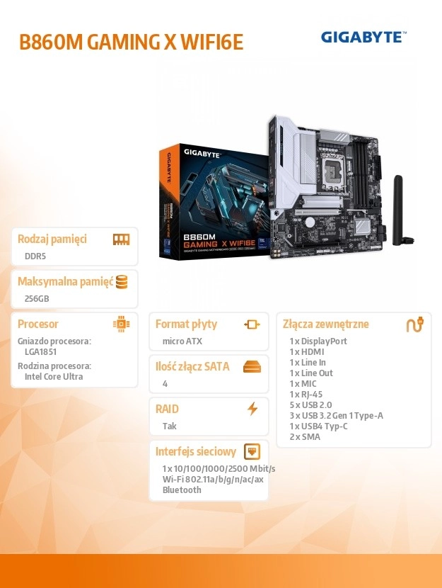 Carte mère mATX compacte pour les tout derniers processeurs Intel Core Ultra (2e génération), offrant un VRM 8+1+2 phases performant, un stockage ultra‑rapide avec M.2 PCIe 5.0 x4, le Wi‑Fi 6E intégré et un LAN 2,5 GbE. Le montage est facilité par les mécanismes EZ‑Latch sans vis, tandis qu’un excellent refroidissement est assuré par le VRM Thermal Armor Advanced et le M.2 Thermal Guard. Une connectique étendue incluant USB4 Type‑C avec DP‑Alt, HDMI et DisplayPort ravira les joueurs comme les utilisateurs exigeants.