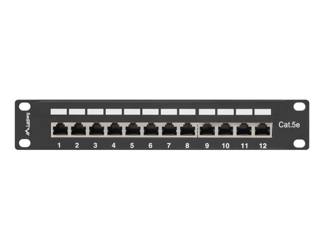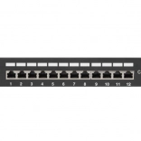 Panneau de brassage professionnel avec 12 ports RJ‑45 blindés de catégorie 5e pour rack 10", offrant une terminaison fiable et une organisation soignée du câblage. Compatible avec les normes T568A/B, il dispose d’un numérotage clair des ports et d’une hauteur 1U pour une intégration facile dans les points de distribution.