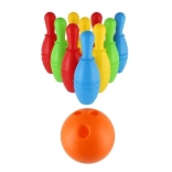 Le paquet contient 10 quilles colorées et une boule de bowling orange avec des trous pour les doigts. Il suffit de les installer et de commencer à jouer.