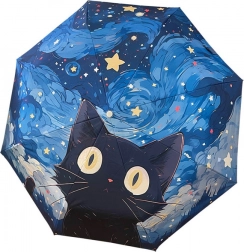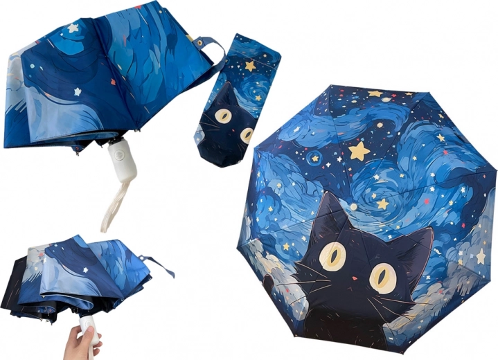 Parapluie pliant automatique est un choix idéal pour un usage quotidien et le voyage. Grâce à sa structure solide et légère, il garantit une longue durée de vie et une résistance aux fortes rafales de vent. Ce parapluie attire l'attention par son design unique avec un motif de chat noir sur un ciel bleu.