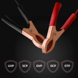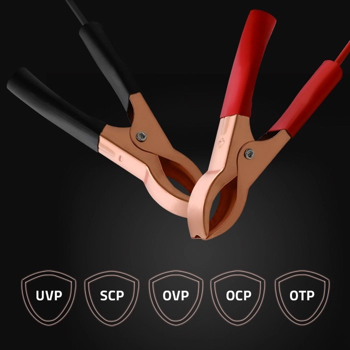 Installation rapide : connectez la pince rouge au pôle +, la noire au pôle –, choisissez le mode et la charge peut commencer. La conception compacte et robuste facilite l’usage à la maison comme à l’atelier.
