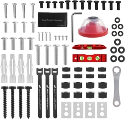 Le paquet comprend également des accessoires de montage supplémentaires tels qu’un niveau à bulle compact pour une installation précise, un collecteur de poussière pour perceuse, des lingettes de nettoyage et des clips pour câbles pour une gestion soignée des câbles.