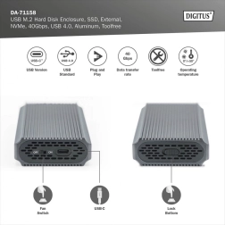 Le boîtier pour disques offre une large compatibilité avec des modules M.2 de différents formats (2230, 2242, 2260 et 2280) et une capacité maximale de 8 To, assurant un espace suffisant pour tous vos fichiers et données. Grâce à la technologie USB 4.0, le transfert de données atteint 40 Gb/s, garantissant une utilisation fluide et des copies efficaces.