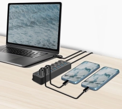 Le hub est équipé d’indicateurs LED qui affichent facilement l’activité de chaque port. Un adaptateur est également inclus pour fournir une alimentation stable, même pour les appareils à consommation plus élevée.