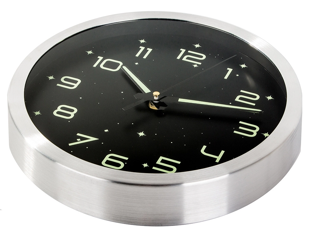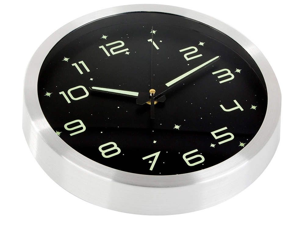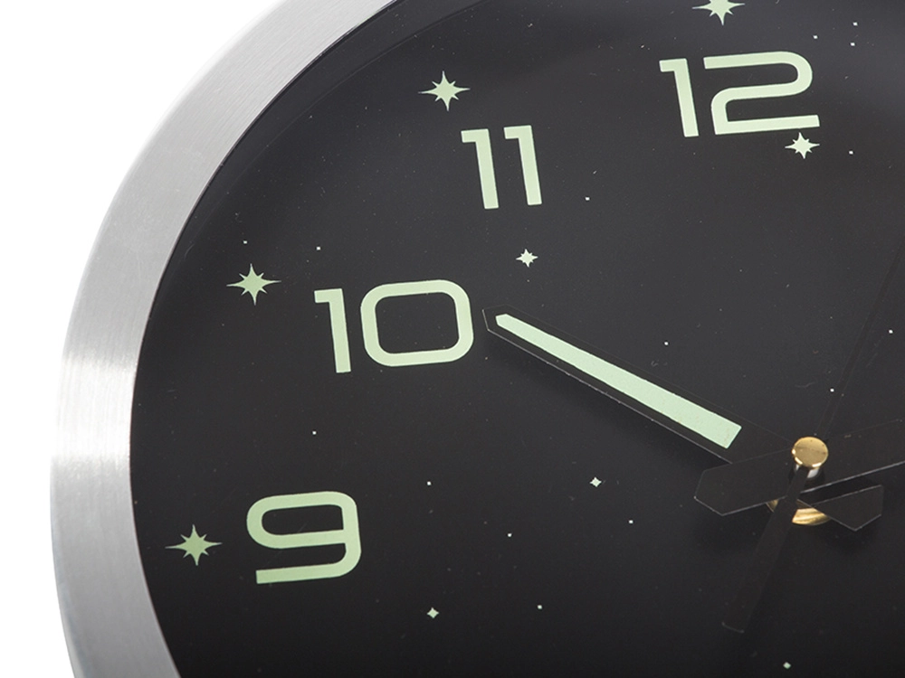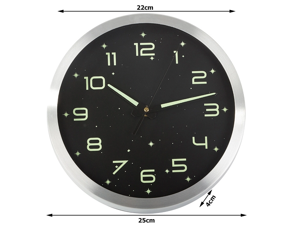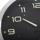 Élégante horloge murale au cadran noir et à la bordure argentée offrant des chiffres, aiguilles et étoiles lumineux pour une lecture aisée de l’heure dans l’obscurité. Grâce à son mouvement silencieux et fluide, elle convient à la chambre, à la chambre d’enfant comme au bureau. Installation murale simple et fonctionnement économique avec pile AA pour un accessoire pratique et stylé dans tout intérieur.