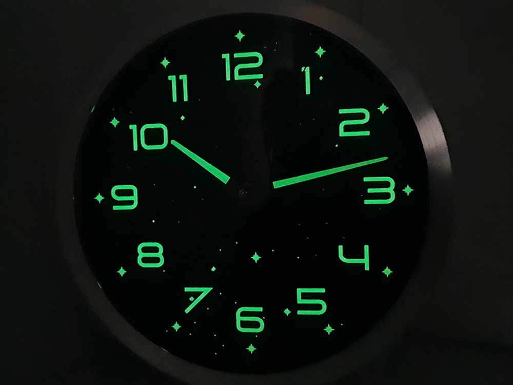 Les chiffres, aiguilles et étoiles luminescents s’illuminent après exposition à la lumière et permettent de lire l’heure confortablement dans l’obscurité.