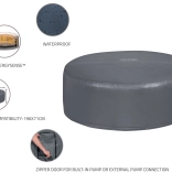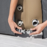 Des détails pratiques facilitent l’usage quotidien : des sangles réglables avec boucles de sécurité garantissent une fixation étanche sans pertes de chaleur et une fermeture éclair intégrée permet de raccorder une pompe intégrée ou externe sans retirer la couverture.