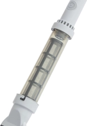 La batterie intégrée offre jusqu’à 50 minutes d’autonomie et se recharge via USB en 4 à 5 heures. Les saletés sont collectées dans un filtre inox facilement accessible, que vous retirez et videz simplement. La tête d’aspiration pivotante avec roulettes et brosses assure un nettoyage minutieux du fond comme des parois sans endommager la surface.