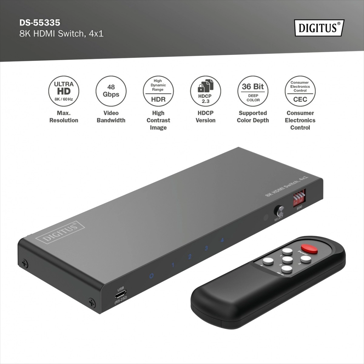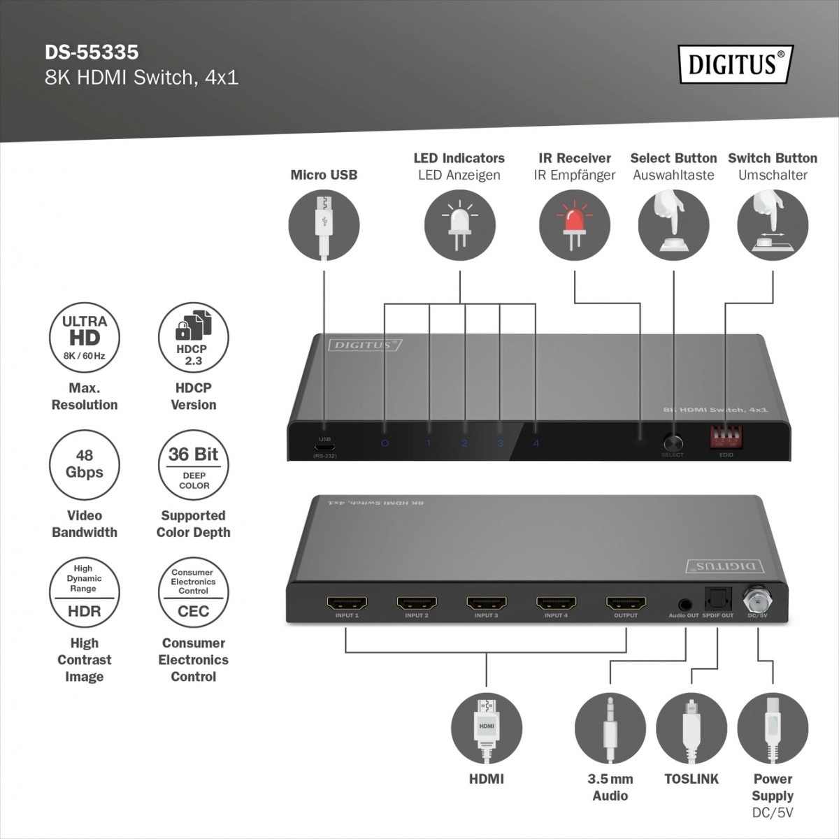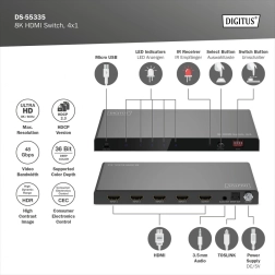 Le commutateur HDMI 8K Digitus, 4x1 vous offre quatre entrées HDMI supplémentaires pour votre moniteur ou téléviseur, ce qui permet de connecter facilement diverses sources avec une seule sortie HDMI. Les signaux audio peuvent également être séparés via Toslink ou la sortie stéréo et lus indépendamment.